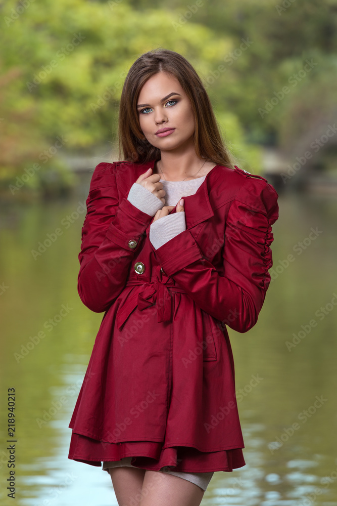 Blonde young woman wearing high fashionable fall, spring jacket in park. Female Model dressed in fashion clothes with a trendy outfit posing outdoor. Teen urban clothing style.