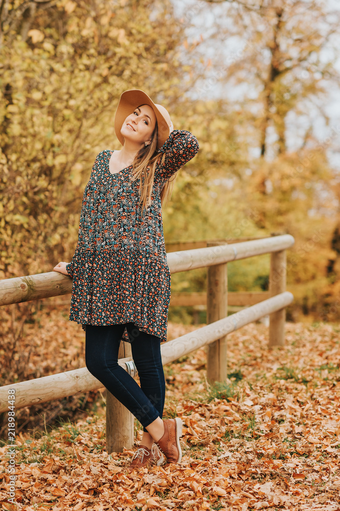 Outdoor portrait of beautiful woman enjoying autumn forest on a nice warm day