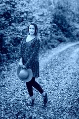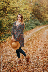 Outdoor portrait of beautiful woman enjoying autumn forest on a nice warm day, holding beige hat in hands