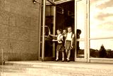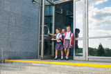 Pupils of primary school. Girls with backpacks near building outdoors. Beginning of lessons. First day of fall.