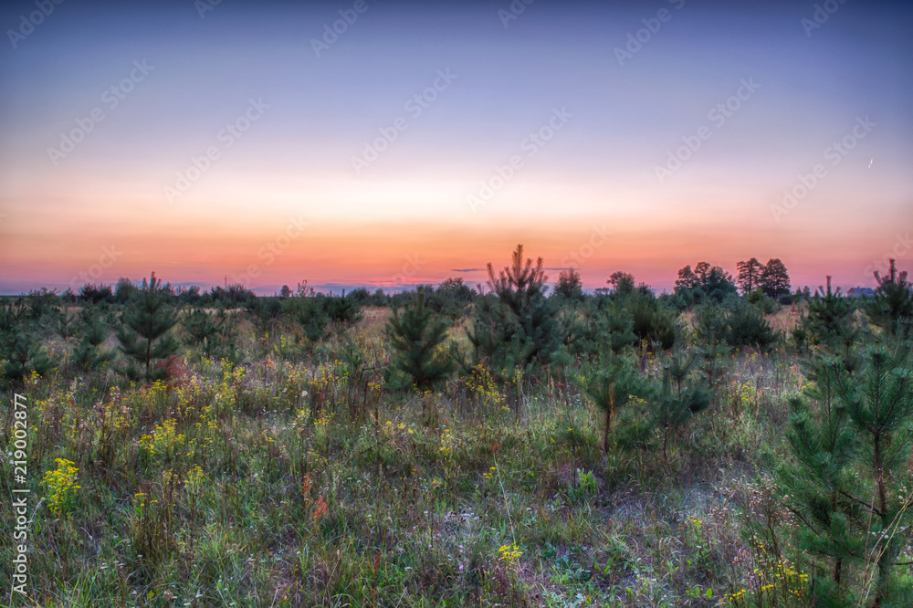 Pole z drzewami rozświetlone zachodzącym słońcem