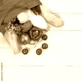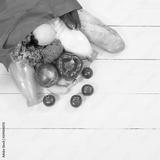 Einkauf Lebensmittel einkaufen Früchte Obst und Gemüse Quadrat Textfreiraum Copyspace von oben Holzbrett