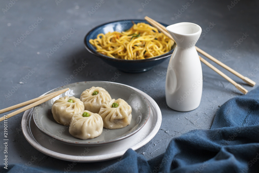 Chinese food: dumplings jiaozi and noodles with vegetables and eggs.