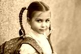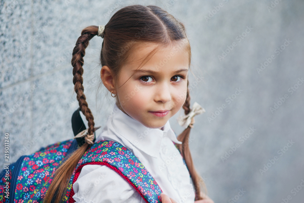 portrait of school girl with backpack after school. Beginning of lessons. First day of fall.