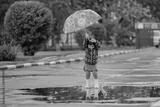 Happy funny child with multicolored umbrella jumping puddles in rubber boots and laughing