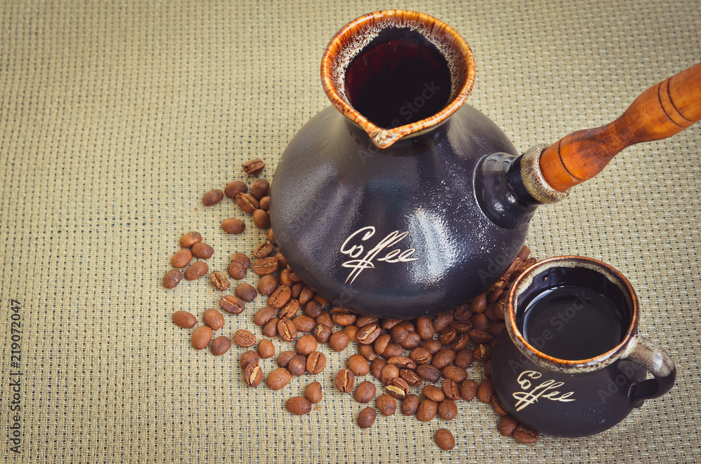 Coffee cezve with two cups and spilled coffee beans on sackcloth background
