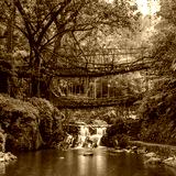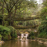 Famous Double Decker living roots bridge near Nongriat village, Cherrapunjee, Meghalaya, India. This bridge is formed by training tree roots over years to knit together.