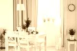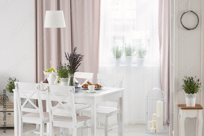 Real photo of white table with fresh lavender and breakfast standing in bright dining room interior with window with drapes