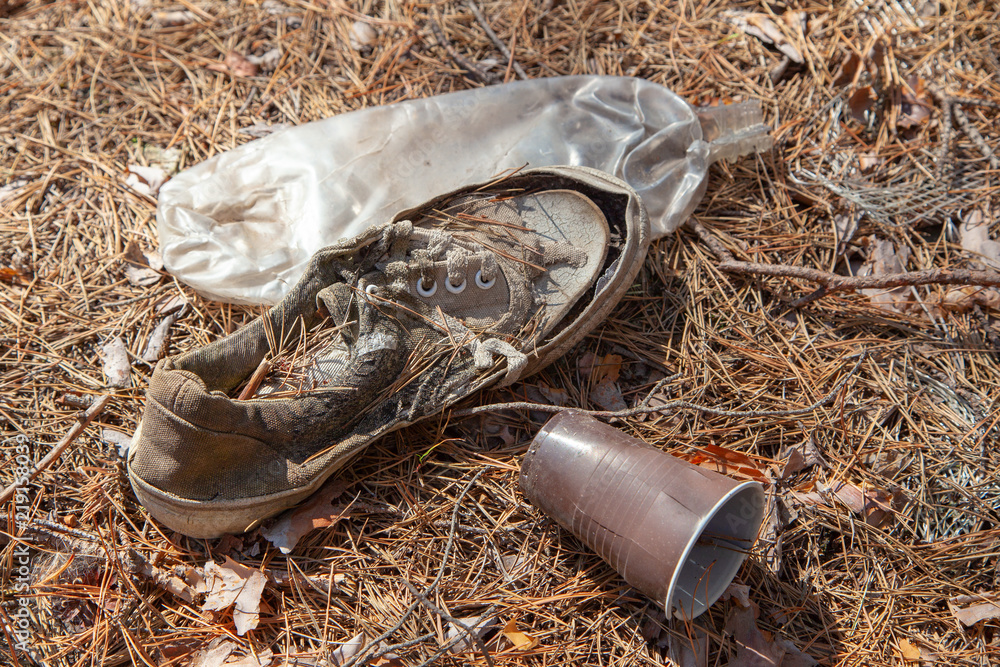 Garbage in the forest. Pollution of wood with plastic and old footwear