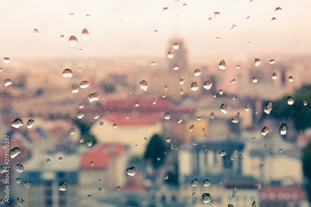 Raindrops on the dirty glass, behind the glass blurred panorama of the old colored city, abstract cozy retro nostalgically background