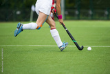 Young hockey player woman with ball in attack playing field hockey game