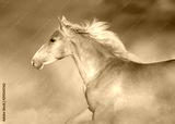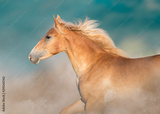 Cremello horse portrait in motion against blue sky