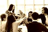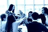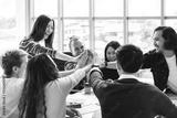 group of young multiethnic diverse people gesture hand high five, laughing and smiling together in brainstorm meeting at office. Casual business with startup teamwork community celebration concept.