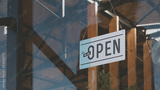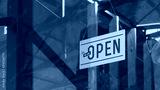 CU we are open sign hanging on the entrance door of a small cafe. Small business concept