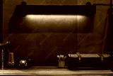 Wooden vintage desk and wall lamp with antique telephone retro style