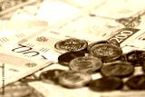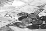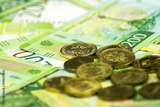 Close up of scattered banknotes and a scattering of coins. Cash Banknotes of 200 Russian rubles and coins of 10 rubles