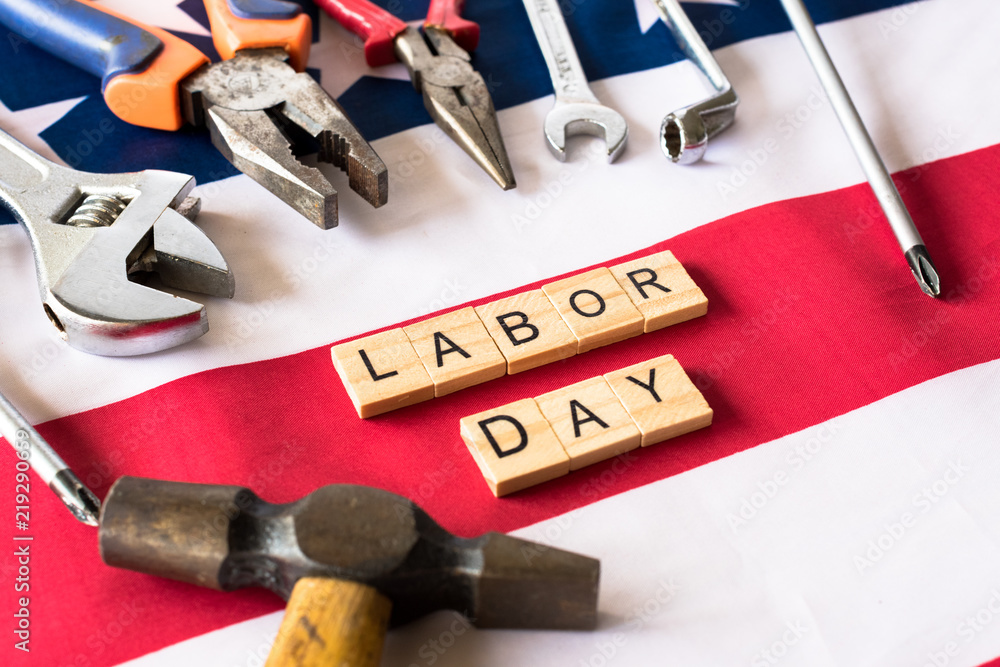 USA Labor day concept, First Monday in September. Different kinds on wrenches, handy tools, America flag and wooden blocks on wooden table.