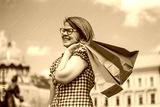 Cute chic young woman in an Italian square laughing while holding paper shopping bags on her shoulder