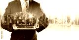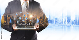 Businessman hold the Industry 4.0 hologram on tablet, Business and Technology, Internet of thinks and network the concept of cryptocurrency, Industry 4.0 concept