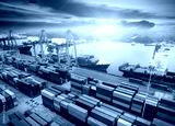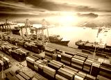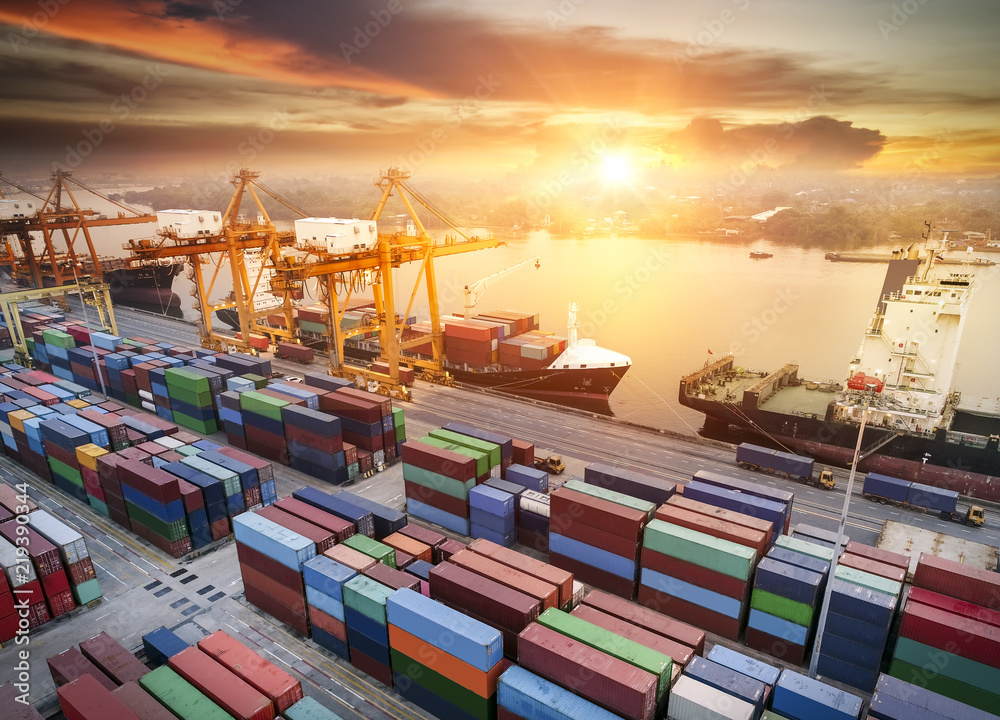 Logistics and transportation of Container Cargo ship and Cargo plane with working crane bridge in shipyard at sunrise, logistic import export and transport industry background