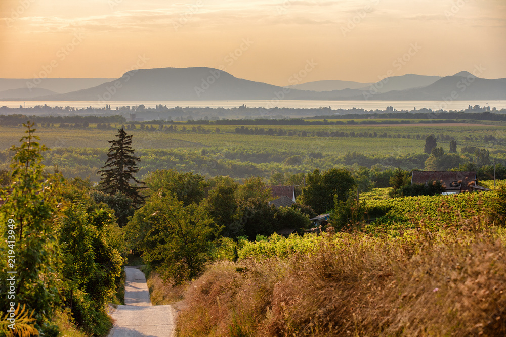 The Badacsony mountain from far with Lake Balaton at sunset in Hungary