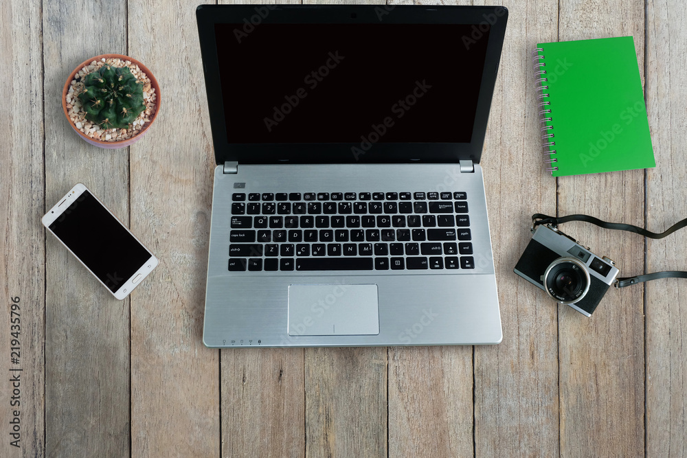 Laptop computer and smart phone and old film camera used electronics gadgets on wooden floor,The equipment of modern photographers concept.