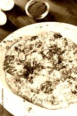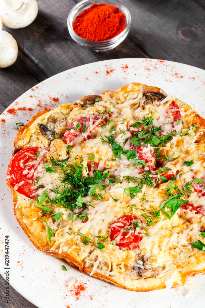 Omelette with slices ham, mushrooms, greens, cheese and tomato on dark wooden background. Hot and healthy breakfast, pizza
