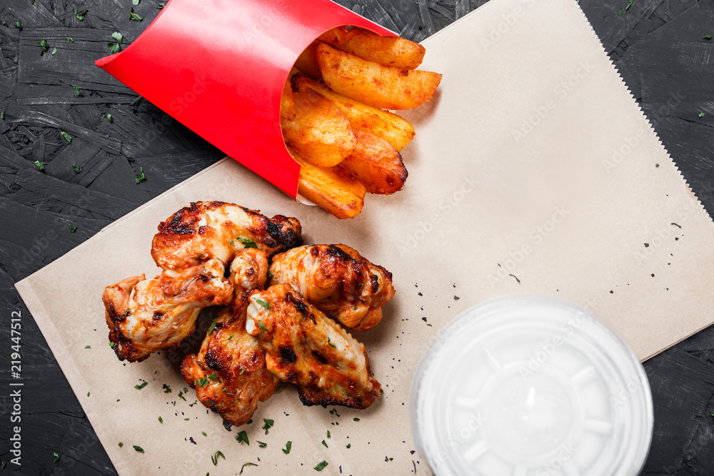 Fried chicken wings with baked potatoes on craft paper on black background. Hot Meat Dishes