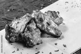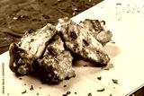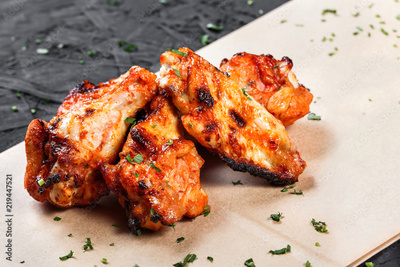 Fried chicken wings with greens on craft paper on black background. Hot Meat Dishes