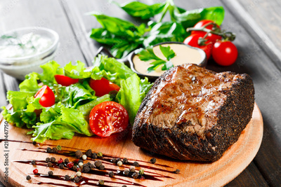 Grilled steak pork with fresh vegetable salad, tomatoes and sauce on wooden cutting board