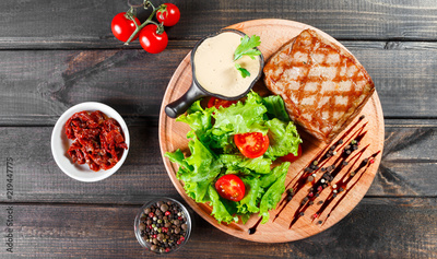 Grilled steak pork with fresh vegetable salad, tomatoes and sauce on wooden cutting board