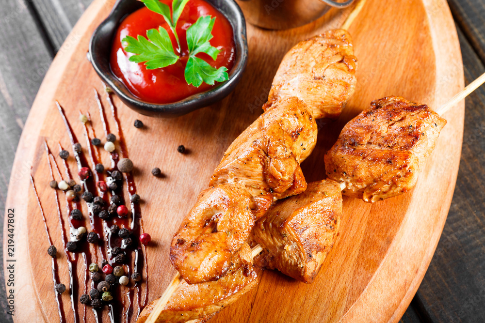 Chicken skewers with sauce and potatoes fries in a bucket on wooden cutting board