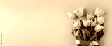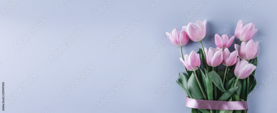 Bouquet of pink tulips flowers on blue background. Waiting for spring. Flat lay, top view