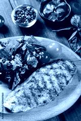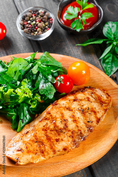 Grilled chicken fillet with fresh vegetable salad, tomatoes and sauce on wooden cutting board. Hot Meat Dishes. Top view