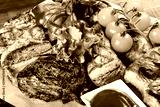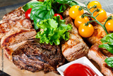 Assorted delicious grilled meat and vegetables with fresh salad and bbq sauce on cutting board on wooden background close up