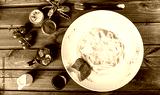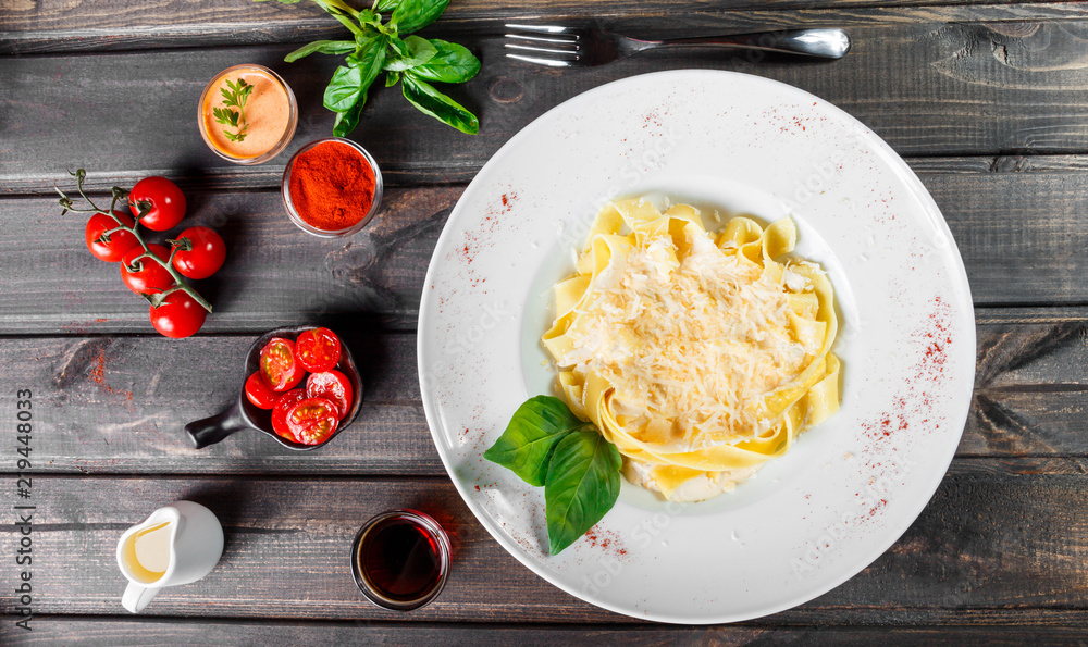 Fettuccine pasta with parmesan cheese, basil and cream sauce on dark wooden background, Italian cuisine. Ingredients on table