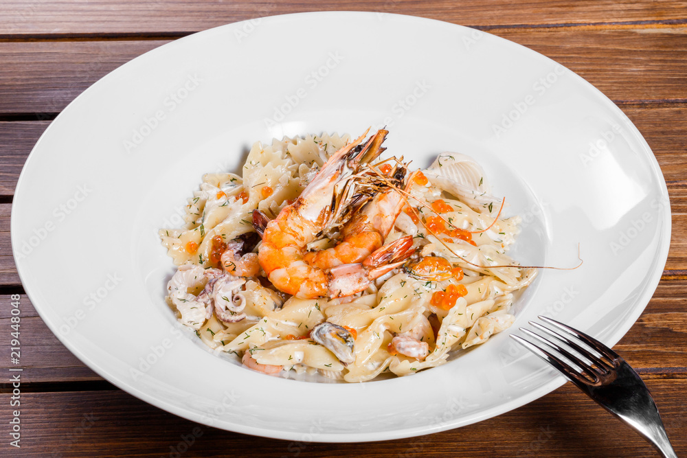 Pasta with seafood, shrimp, mussels, octopus, oysters, herbs and cream sauce on wooden background, Italian cuisine