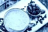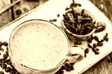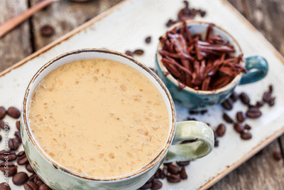 Oatmeal porridge with coffe and grated chocolate on bright wooden table. Selective focus. Healthy breakfast, vegan food. Top view