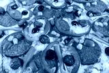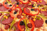 Pizza with salami, sausage, frankfurters, red pepper, cucumber, corn, green and black olives isolated on white