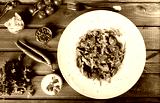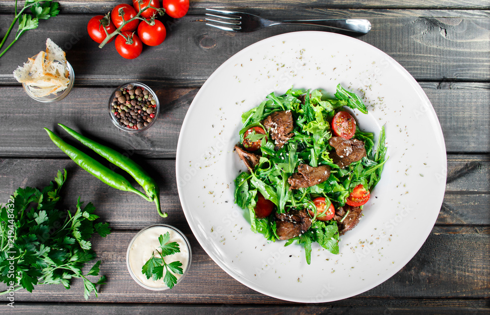 Hot salad with fried liver, cherry tomatoes and mixed greens on dark wooden background. Healthy food. Ingredients on table