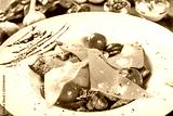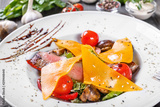 Hot salad with beef steak chargrilled to medium rare with cherry tomatoes, mushrooms and cheese on dark wooden background