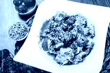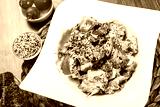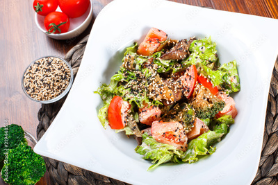 Warm salad with chicken liver, tomatoes, lettuce leaves, broccoli on wooden table. Healthy food. Top view