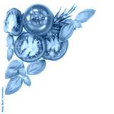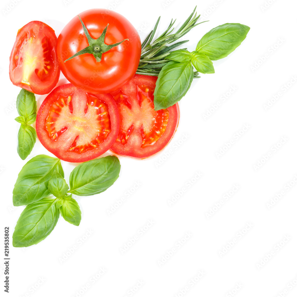 Tomaten mit Basilikum Gemüse von oben Quadrat Textfreiraum Copyspace freigestellt Freisteller isoliert