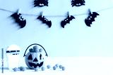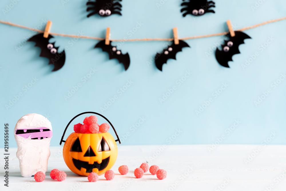 Halloween crafts, orange pumpkin, ghost , mummy and spide, bat on wooden table with copy space for text. halloween concept.