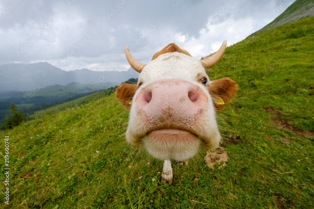 Funny portrait of a cow muzzle close-up on an alpine meadow in Switzerland