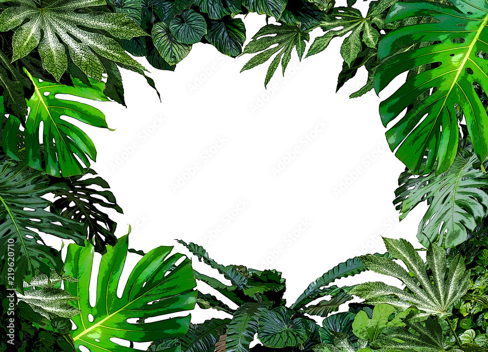 Tropical green leaves frame floral plant monstera isolated background
