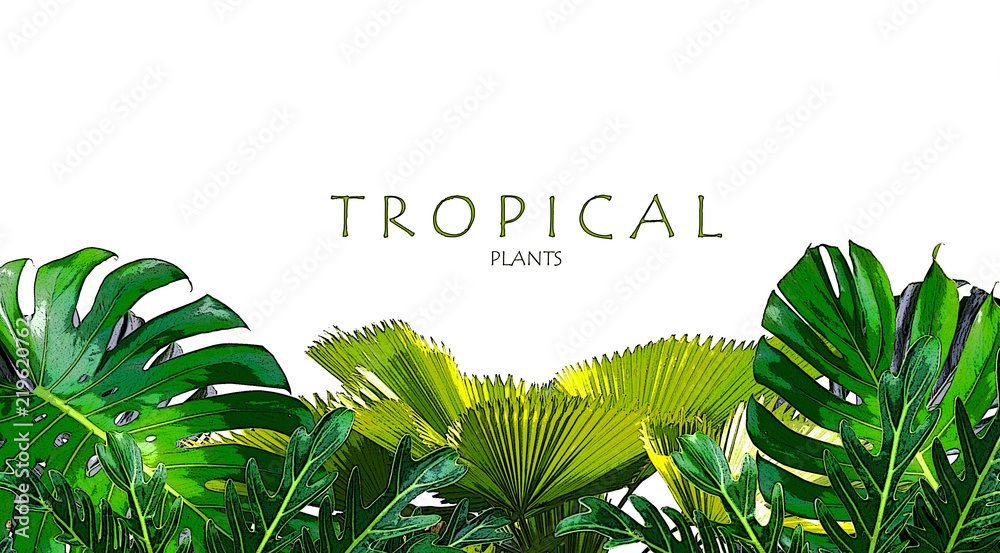 Tropical green leaves frame floral plant monstera isolated background