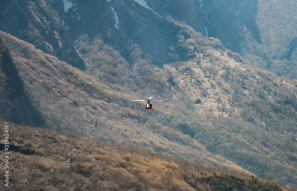 Helicopter rescue in Himalayas mountains range, Nepal.