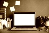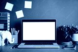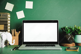 Creative desk with laptop mock up screen, books, plants, office accessories, elephant fgures and memo stick. Green design home office interior.