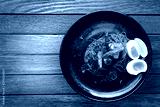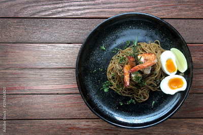 asian food design spagetti shrimp with basil leaf and boil egg